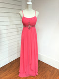 This long chiffon dress, with gems along  the waistline of the dress gives the opening to the dress a beautiful flare, it looks stunning worn for an evening out with a pair of heels or can be dressed down with a pair of flat sandals.